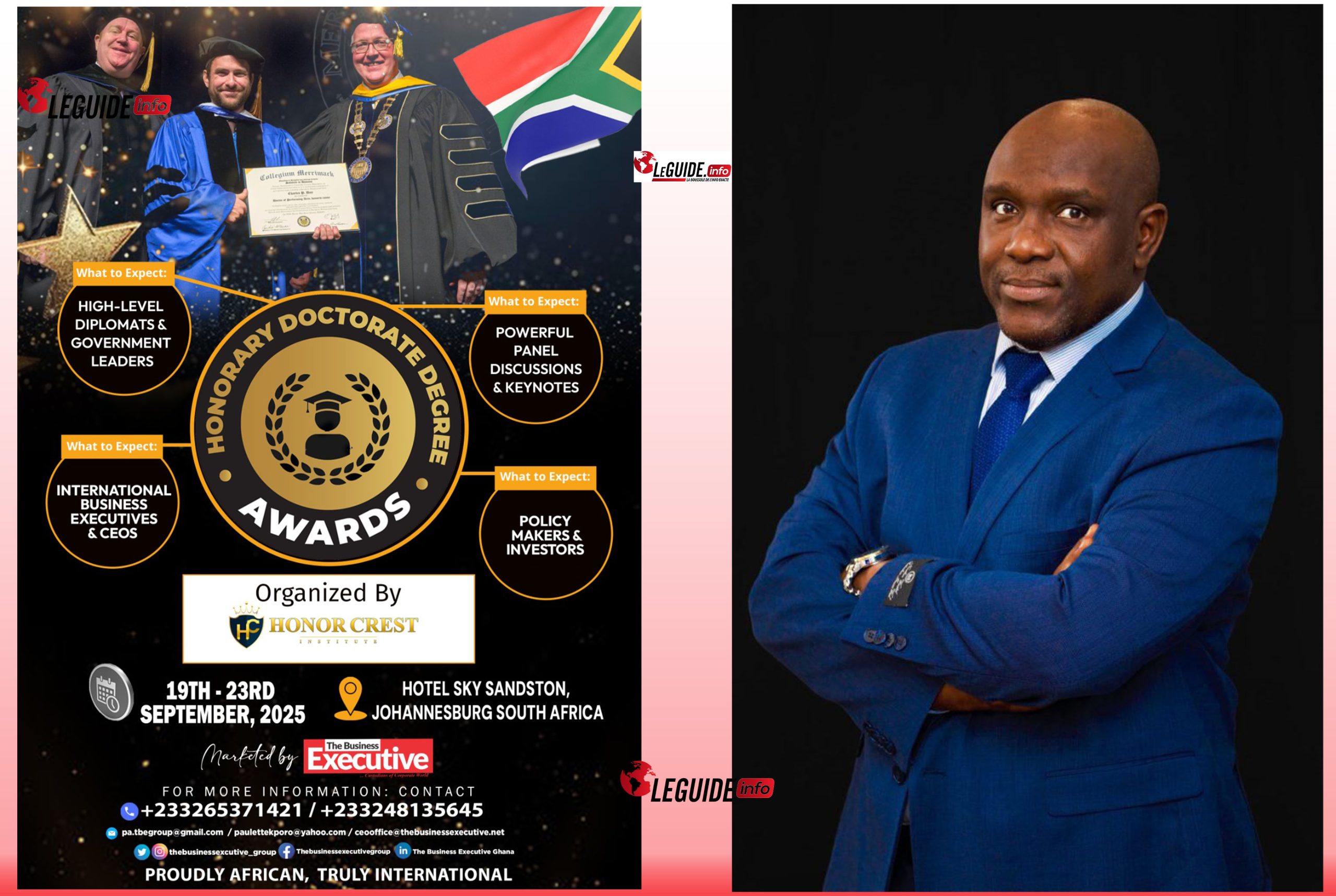 “Nous avons été contacté aujourd’hui par Elizabeth Boakye, depuis le bureau de The Business Executive à Accra, au Ghana pour nous annoncer que vous avez été nommé pour recevoir un doctorat honorifique lors d’une cérémonie prestigieuse qui se déroulera du 19 au 23 septembre 2025 à l’hôtel Sky Sandston, à Johannesburg en Afrique du Sud”, peut-on lire sur la note d’information.